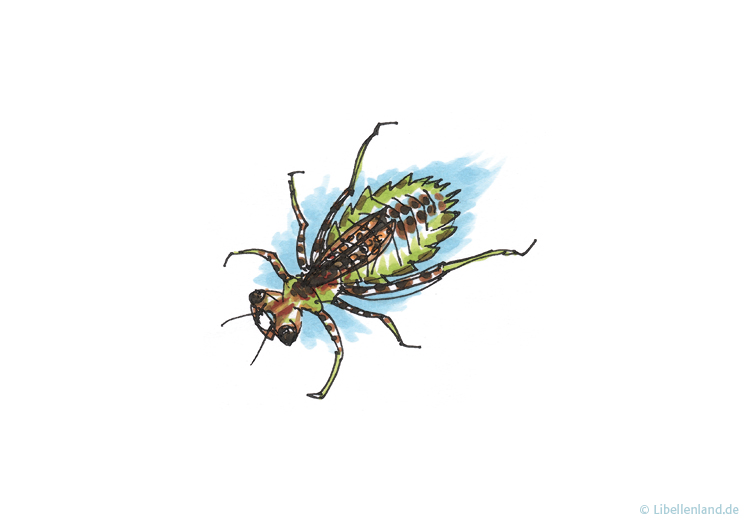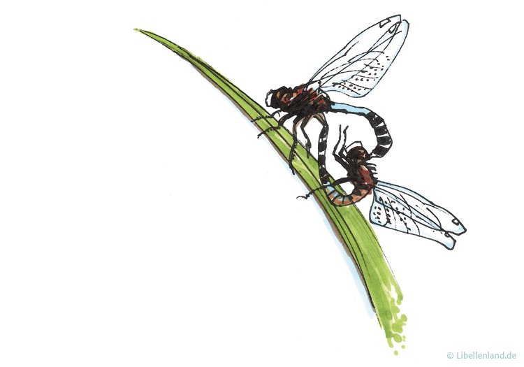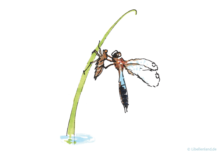 Nach mehreren Häutungsschritten unter der Wasseroberfläche klettert die ausgewachsene Libellenlarve meist an Halmen über die Wasseroberfläche, wo sie sich in ihrer Exuvienhaut verpuppt und die abschließende Verwandlung (Metamorphose) zum Fluginsekt stattfindet. Schließlich platzt die Larvenhaut und die Libelle schlüpft: nachdem ihr langgestreckter Körper und die zarten Flügelpaare getrocknet sind, startet sie zu ihrem Jungfernflug ... damit beginnt der Kreislauf des Libellenlebens von Neuem !